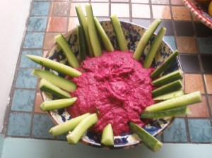 This months recipe is for beetroot hummus. It’s very easy to make and I love the wacky purple colour and fresh flavour .It doesn’t matter too much the size of the beetroots that you use, it’s more important that they are fresh so don’t use ones that are pre cooked and vacuum packed.