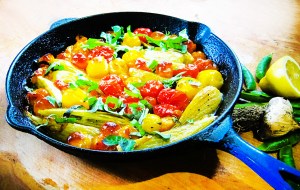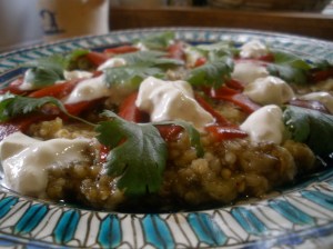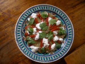 I like to serve this with sour cream and roasted peppers and a little fresh coriander or flat leaf parsley to garnish. The roasted piquillo peppers that you can buy in jars are ideal for this,