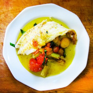 Peel a couple of cloves of garlic and give them a rough chop then put them together with the aubergine flesh and chop everything together until it becomes a puree. Tip the aubergine into a bowl, squeeze over the juice of a lemon, stir in a couple of spoonfuls of extra virgin olive oil then season with some salt.