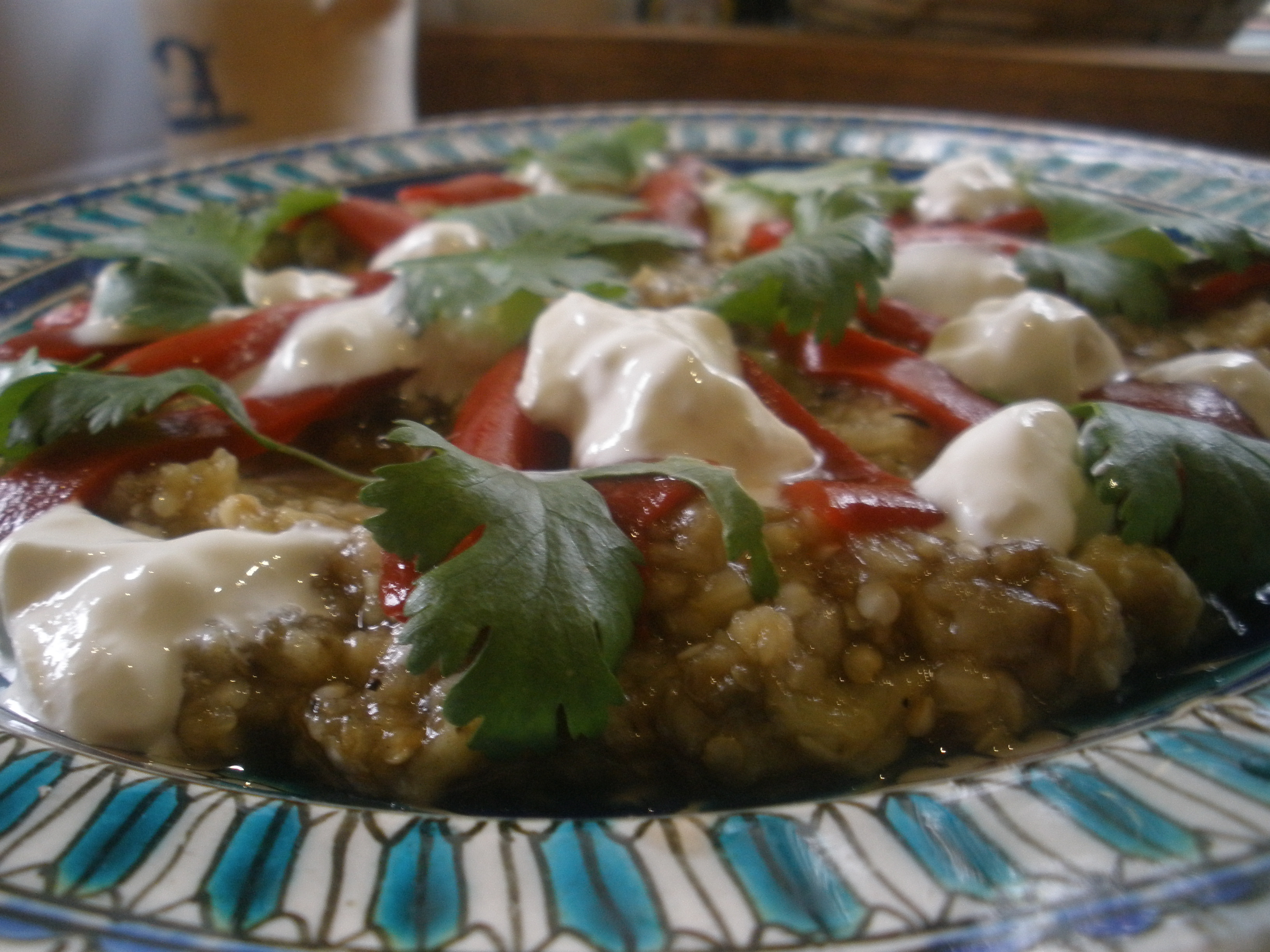 It’s great dish to share. Put the plate in the middle of the table and eat with pitta breads or crusty bread. I found a lovely plate that someone had bought to our house at a previous occasion yesterday to put the aubergine on and it looked lovely. We took the dish to the neighbours birthday party and one of the other guests promptly claimed the plate back!!