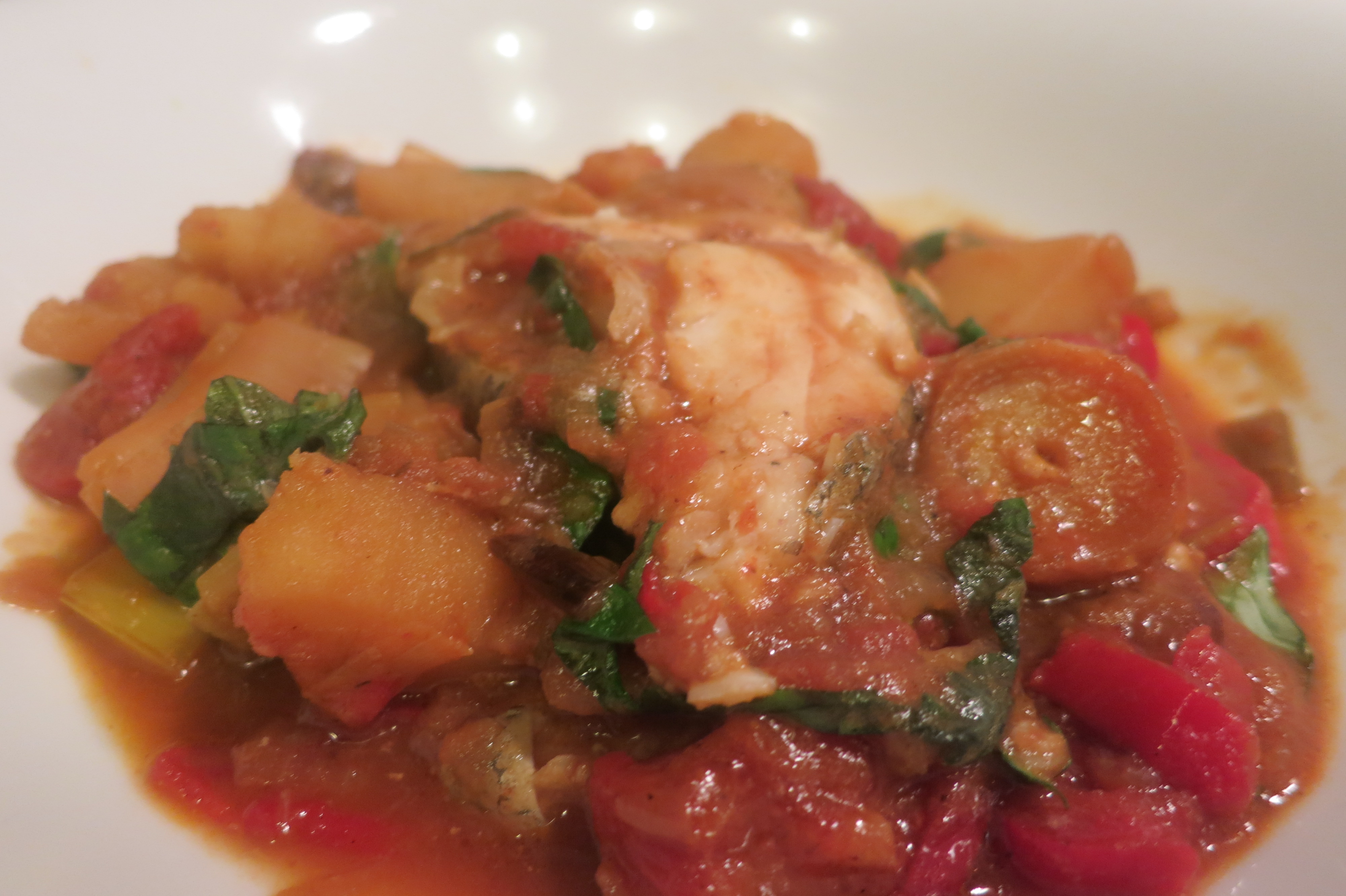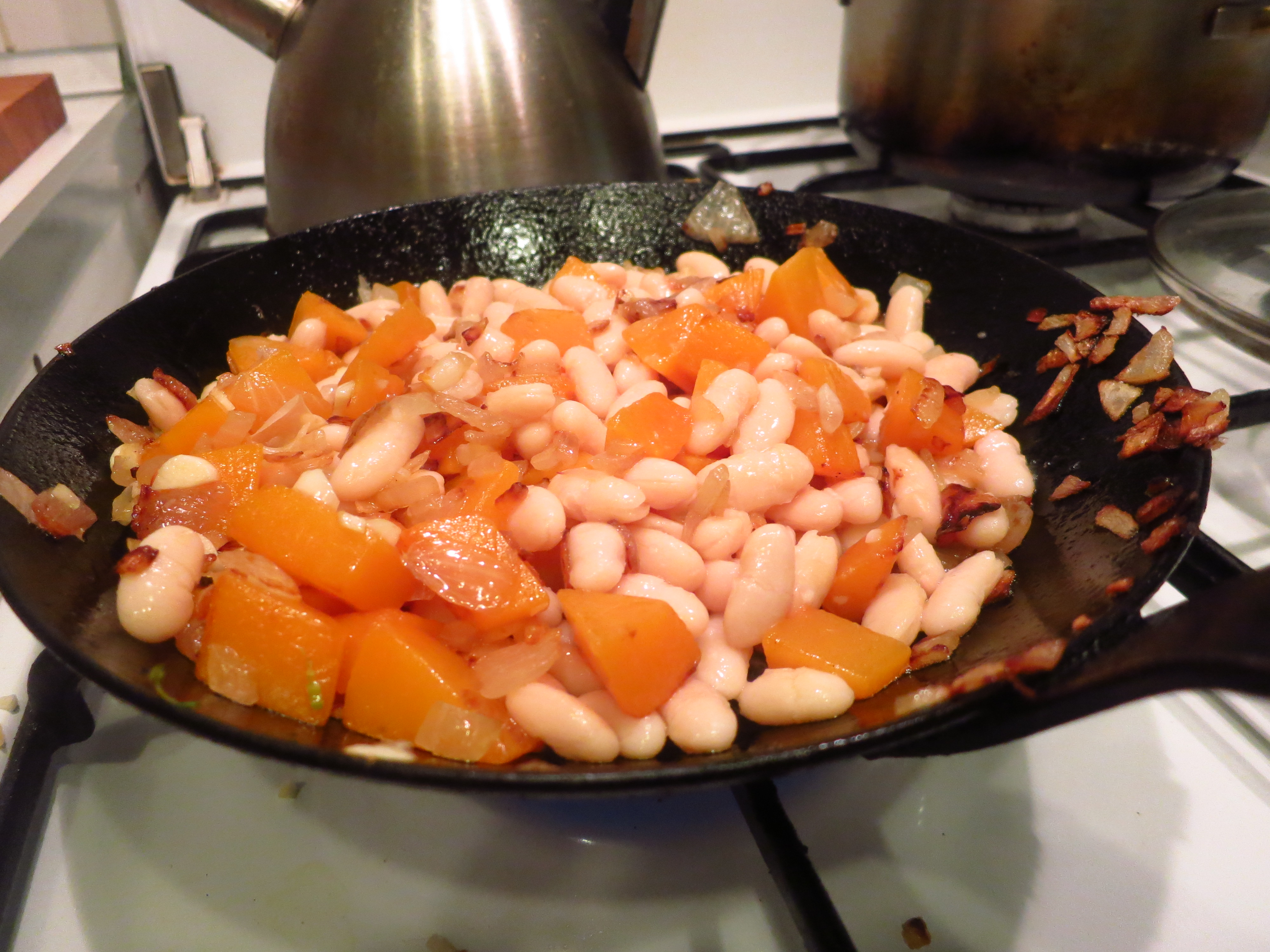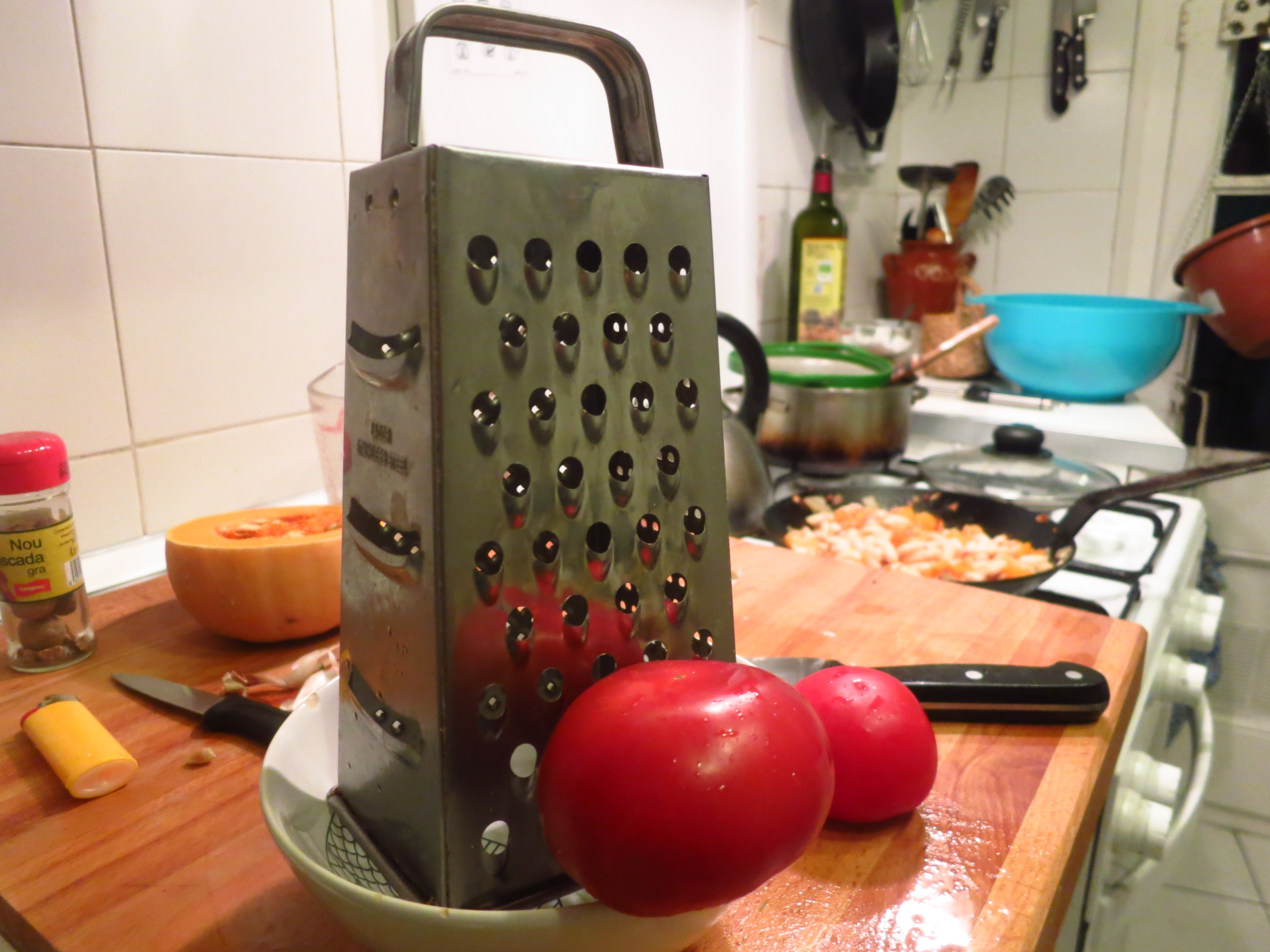 The garden has soldiered on whilst I have been away, oblivious to the weather and there is a surprising amount to eat there, including our seemingly never ending supply of cauliflowers. I was surprised to see them, I thought they would have ‘blown’ by now but they must have settled into some kind of state of animated suspension because they are still ready to eat. There are also plenty of leeks, spinach, salad greens, kale and herbs. I didn’t know what to make for dinner so I wandered around with a bucket and picked a little bit of this and a little bit of that then came down to the house and discovered our last pumpkin.