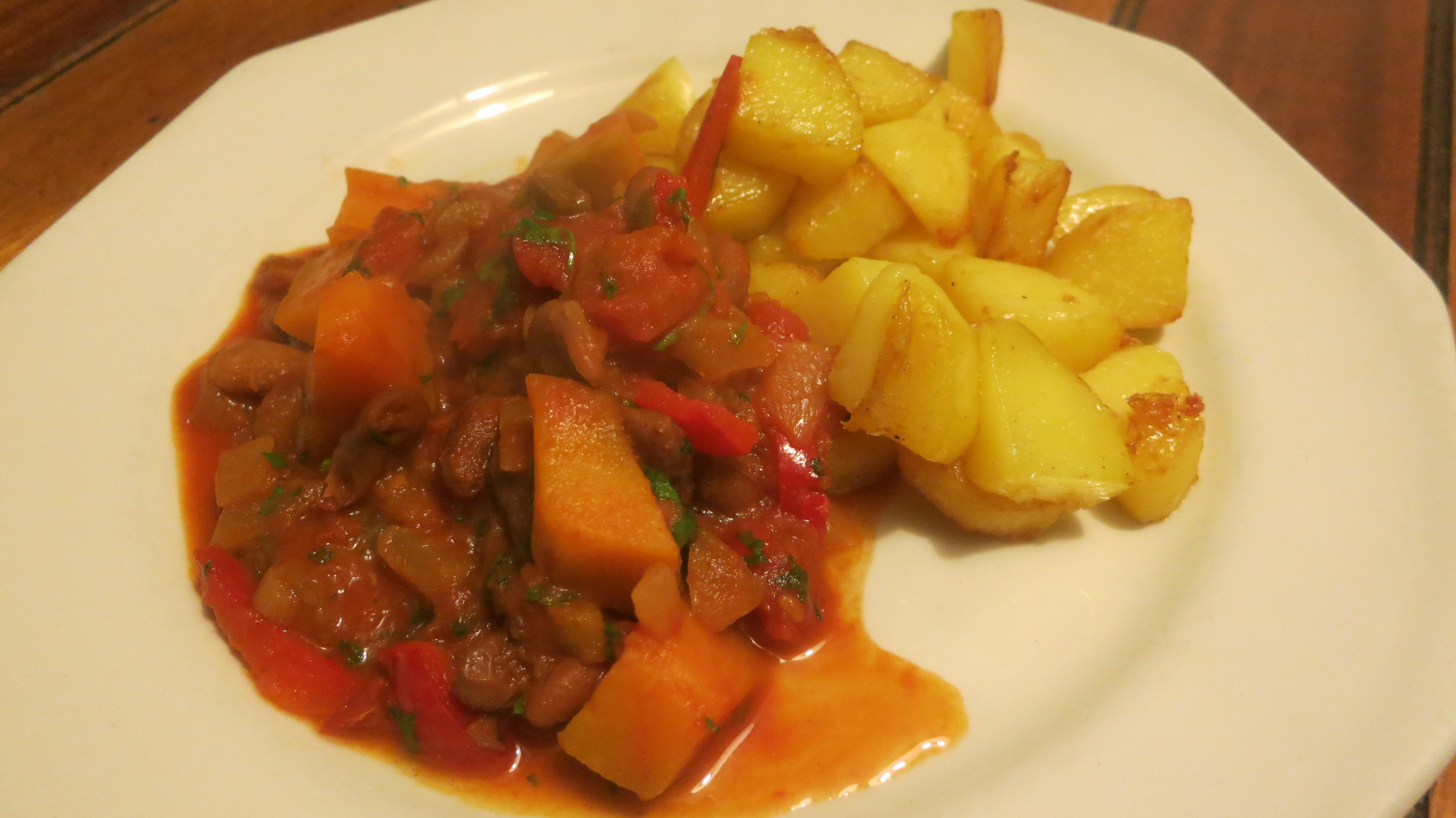 Despite being hungry I was reluctant to cook and plomped down beside the stove with a cup of tea and the paper. Of course I only got hungrier and in the end I leapt up and started to root around the kitchen, trying to find something. I found a little bag of borlotti beans in the freezer and the dinner progressed from there, using up the rest of the pumpkin that was sitting on the window sill and a few anchovies that were left over from the pork pie mission, all jazzed up with tomatoes, onion, a star anise and smoked paprika. It tasted something like Boston Baked Beans. I made little chippy potatoes to go with and it certainly sated my hunger