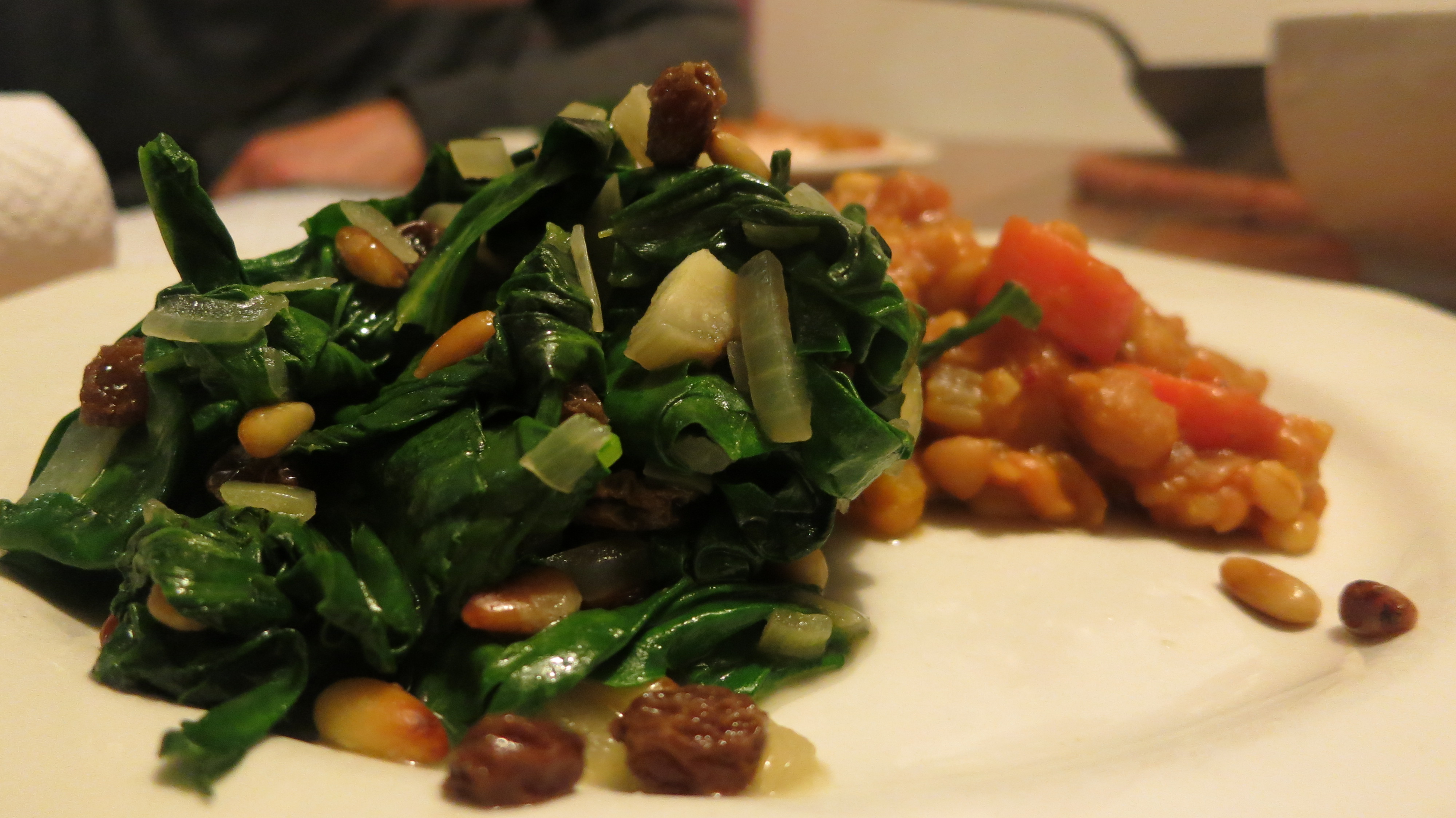 Peel and finely chop the onion. Heat a little olive oil in a large pan and cook the onion until it softens but don’t let it brown. Add the spinach, a little salt then stir to mix everything together. Cover with a lid and cook gently for a few minutes until the spinach has wilted and is tender.. Add the raisins and pine nuts, toss everything together and serve.
