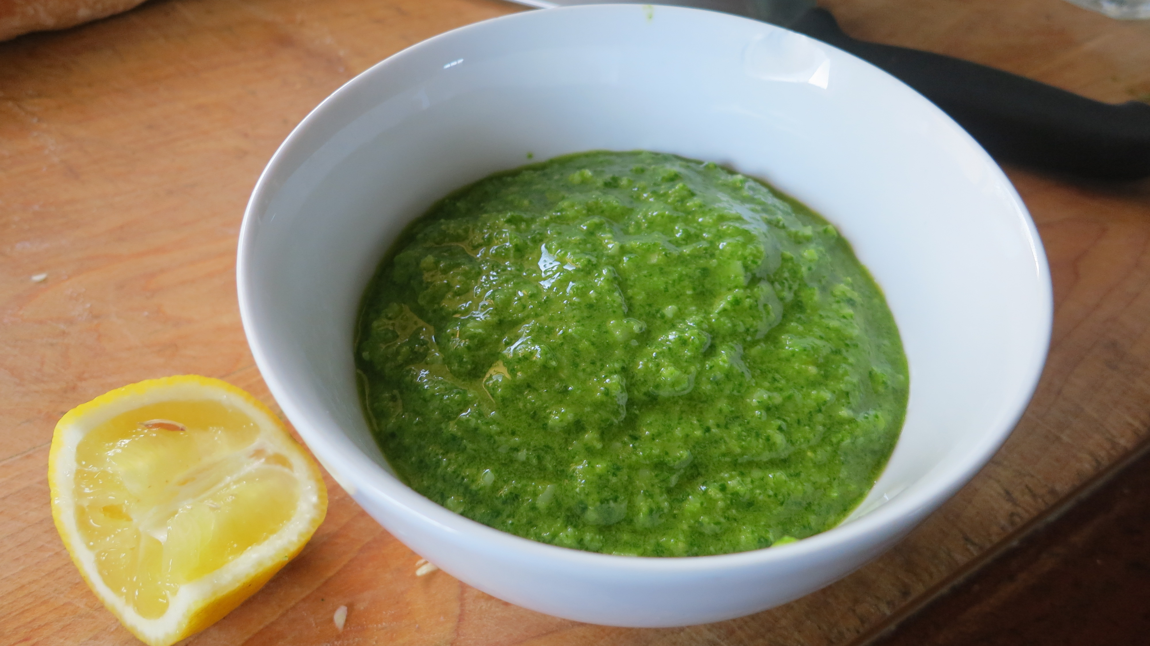 Place the sunflower seeds and pinenuts into a food processor with the garlic and blitz until fairly finely ground. Add the rocket and slowly pour in the olive oil and lemon juice. Add the Parmesan and mix well. Season with a little salt and adjust the consistency by adding a little more oil if necessary. Tip into a bowl. Put a layer of olive oil over the top if the pesto isn’t going to be used immediately. This will stop the pesto from oxidising. Use within the week.