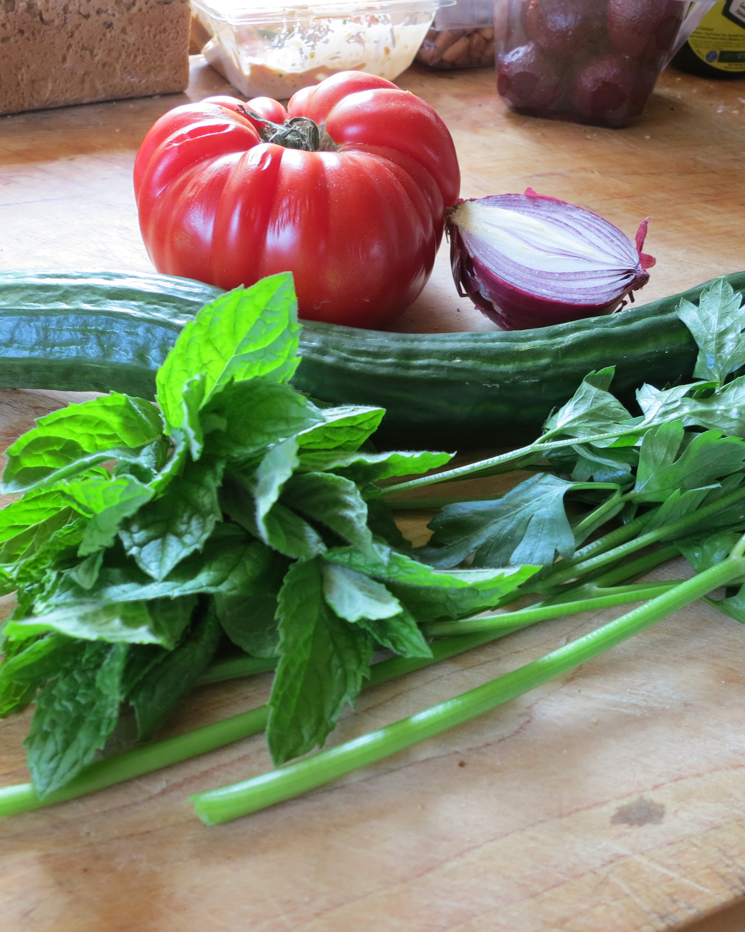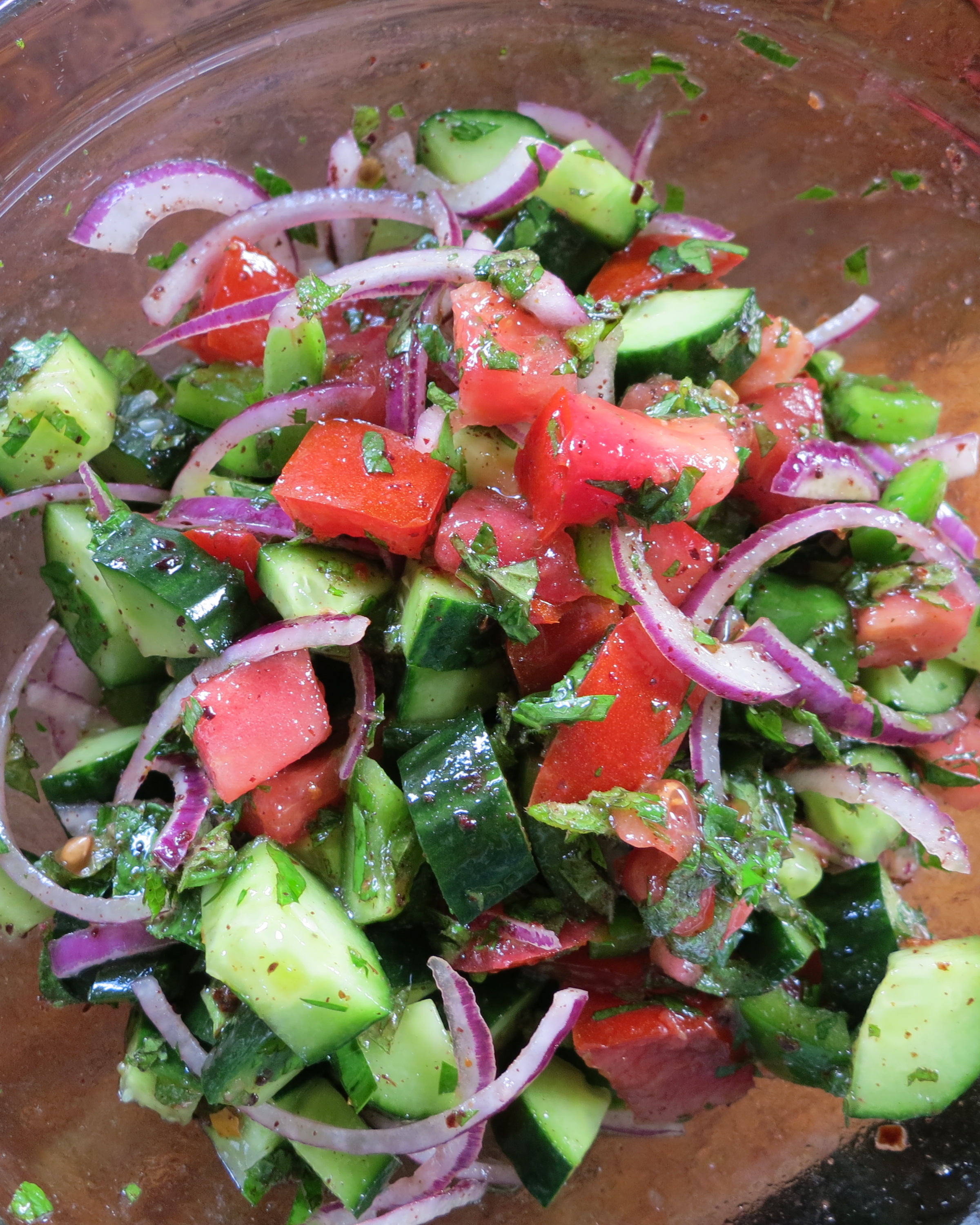 Put all the vegetables and herbs into a bowl, sprinkle over a little salt, one teaspoon of sumac, olive oil and lemon juice and gently toss everything together.