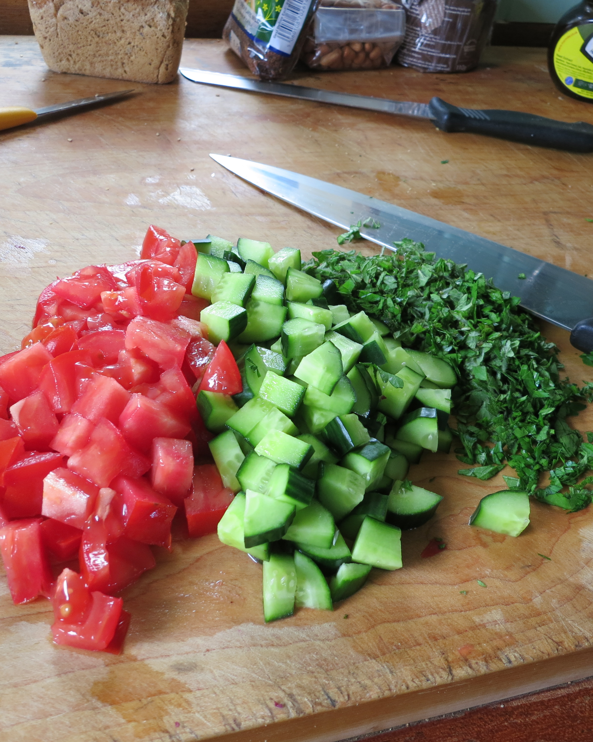 Cut the cucumber into quarters lengthwise then chop into an equal size dice – about 1cm