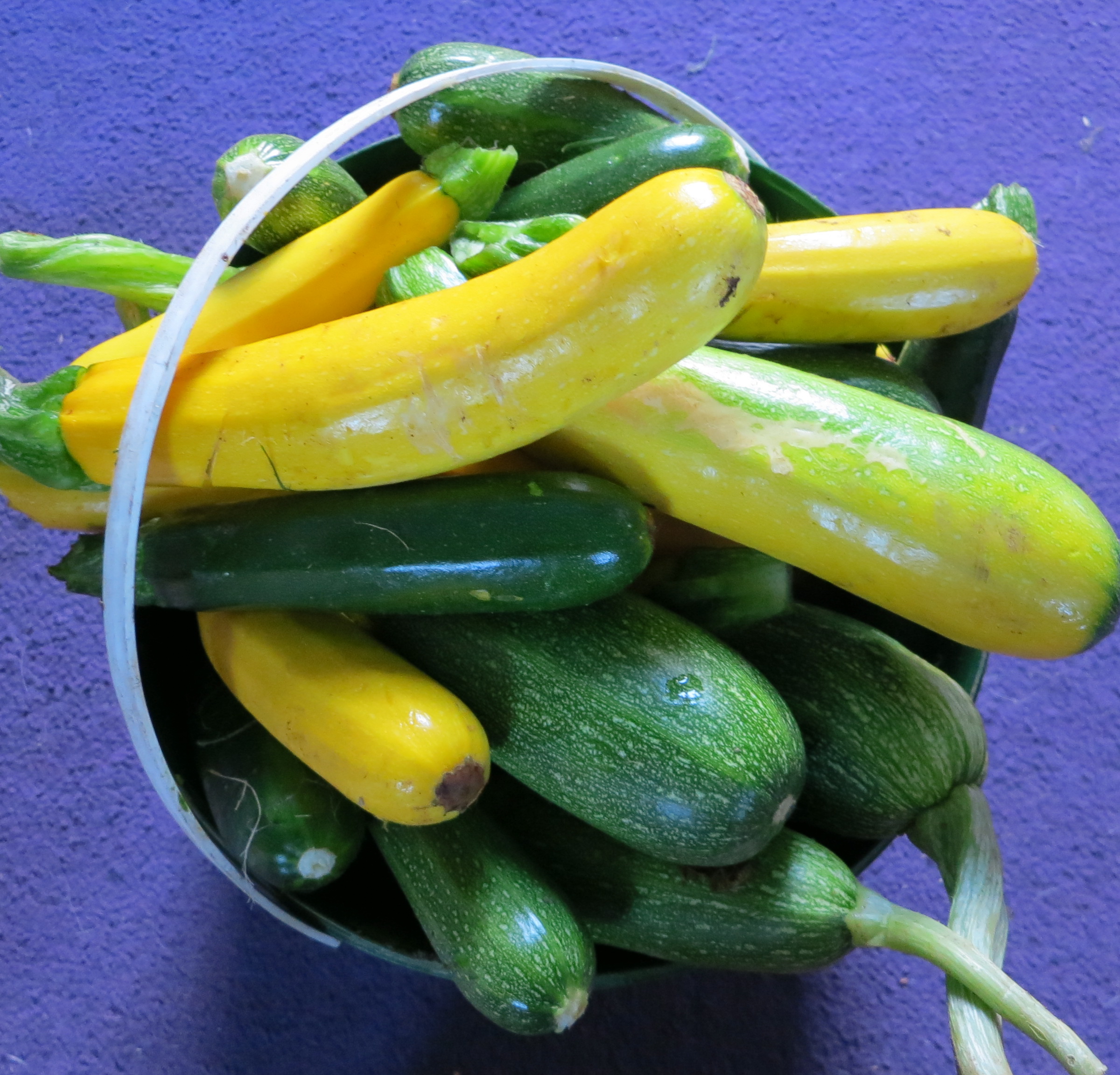 Contrary to my firm belief that courgettes love sunshine I now realise they equally love the rain. We watered our courgettes every day during the heat-wave and although the plants looked super healthy there weren’t very many courgettes. Since the weather has returned to a more ‘normal’ warm rain/sun showers they are thriving. I swear they are growing before our eyes. Each day we pick a bucketful, which means the courgettes are at least doubling in size each twenty four hours.