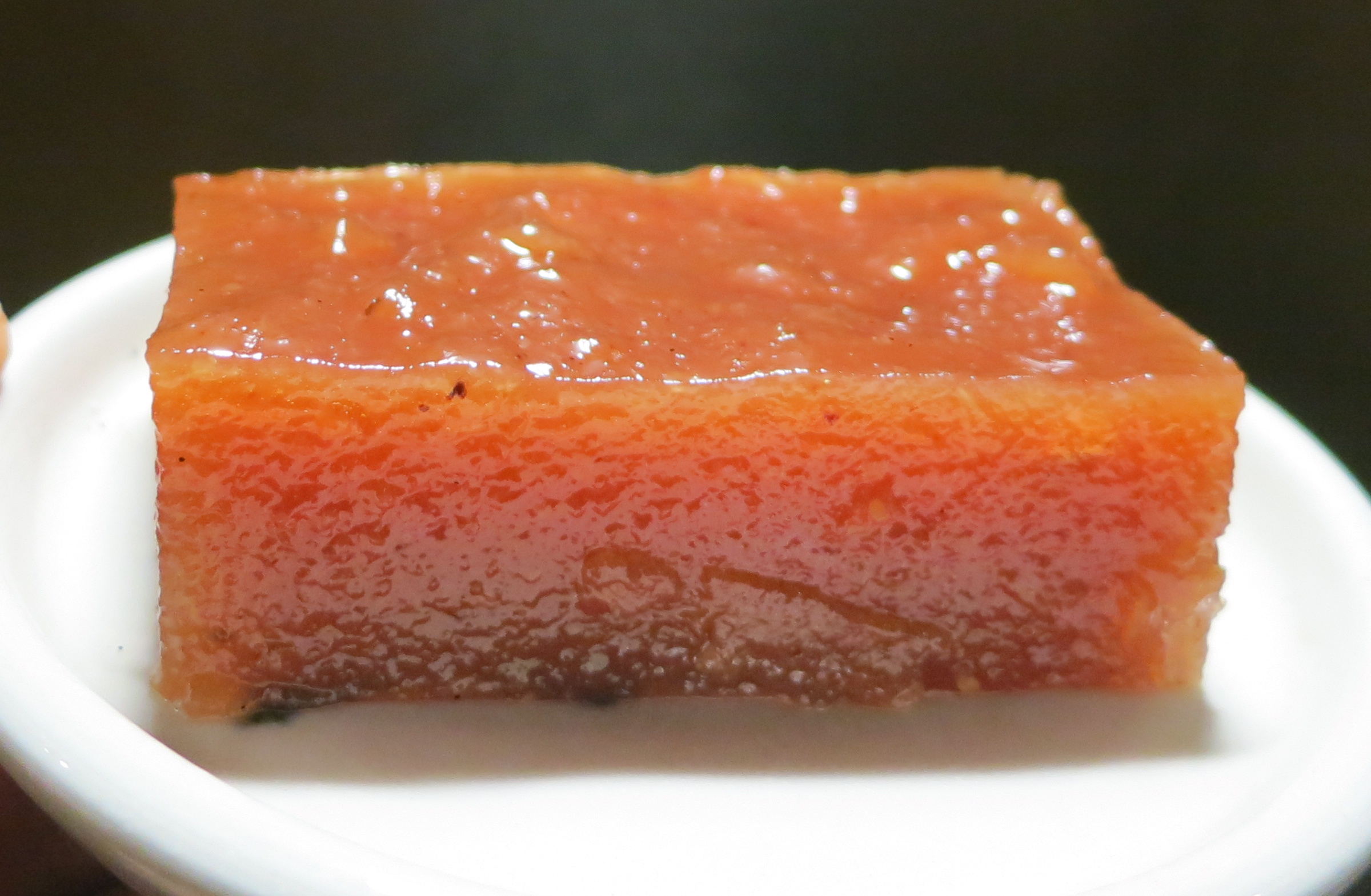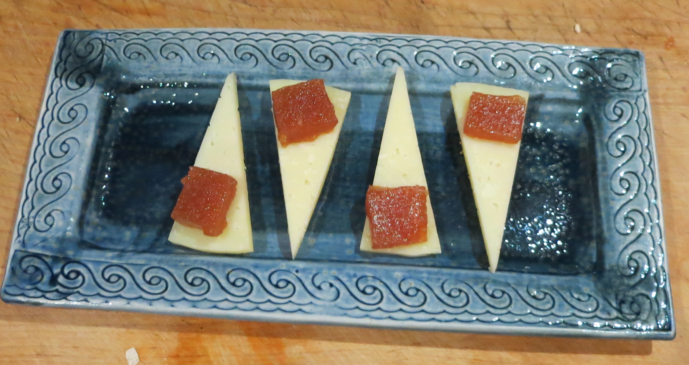 Membrillo is a set quince jelly that is eaten in Spain with cheese. The first time that I ate membrillo we were guests in a friends’ mother s house in the north of Spain. It was a small village near the Portuguese border and the mother welcomed us into her little house and made us a feast. The dessert was fresh white cheese and membrillo. The cheese didn’t look very appealing to me but it would have been rude to refuse. It was delicious,. Somehow the musky sweetness of the membrillo opened up the delights of this otherwise quite bland cheese. I’ve been a fan ever since although these days I usually enjoy membrillo with Manchego, which is a hard Spanish sheep cheese.