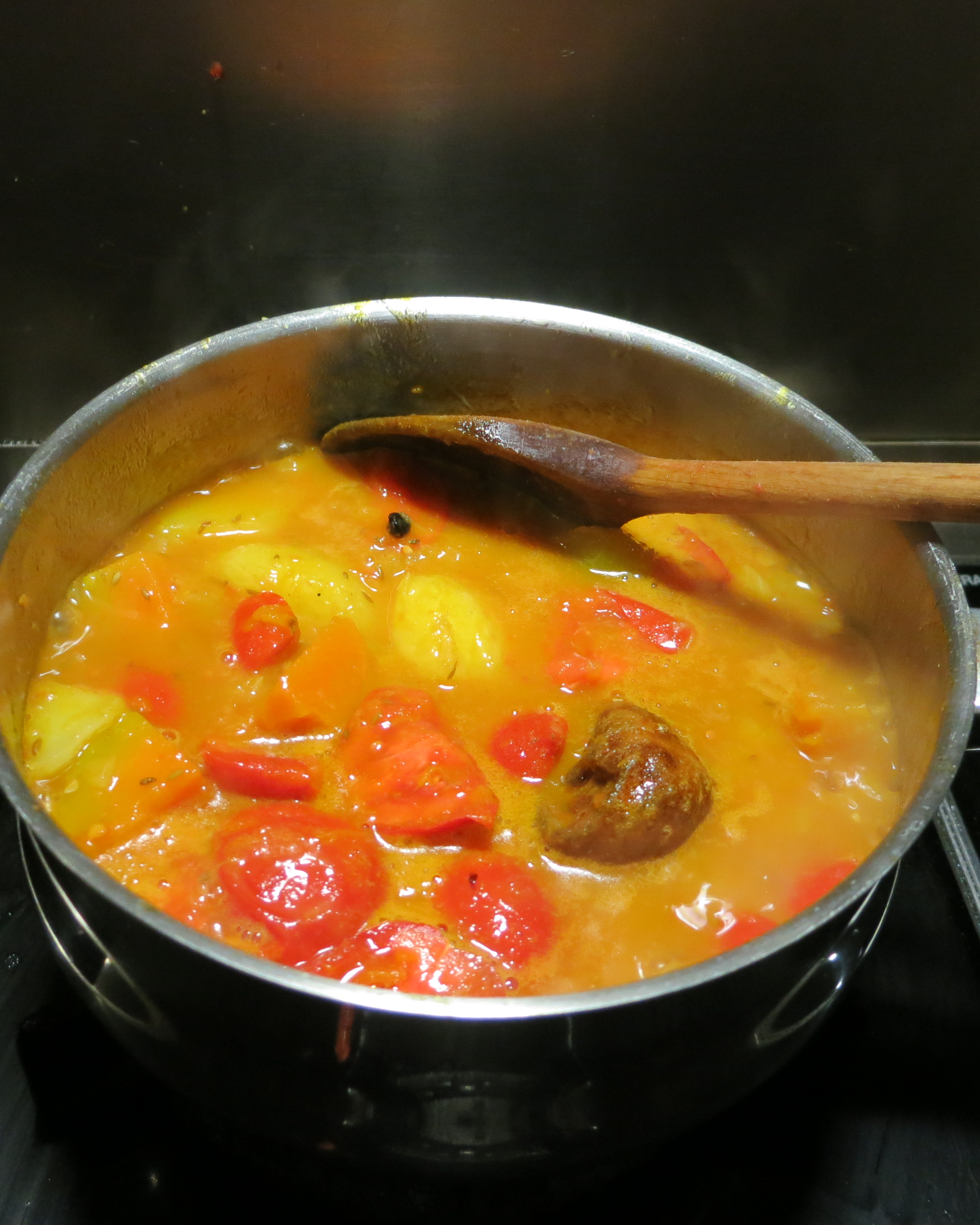 The recipe began with cooking onions, cummin seeds and turmeric in clarified butter. I made some clarified butter – these instructions weren’t included in the original recipe – by gently cooking some butter in the pan until it frothed up and the milk solids went golden and sank to the bottom. I didn’t bother to strain it as I wasn’t bothered about the bitty bits, I just like the flavour, and continued as instructed. I didn’t have any tomato paste either so I grated fresh tomato in on top of the onions. This is always a handy trick when something like that is called for. I added in chunks of potato, pumpkin and the Iranian lime which I stabbed a few times as instructed and added a little salt and enough water tocover everything. Initially the lime bobbed about on the top like a life-buoy but with a little encouragement from my wooden spoon it did eventually submerge.