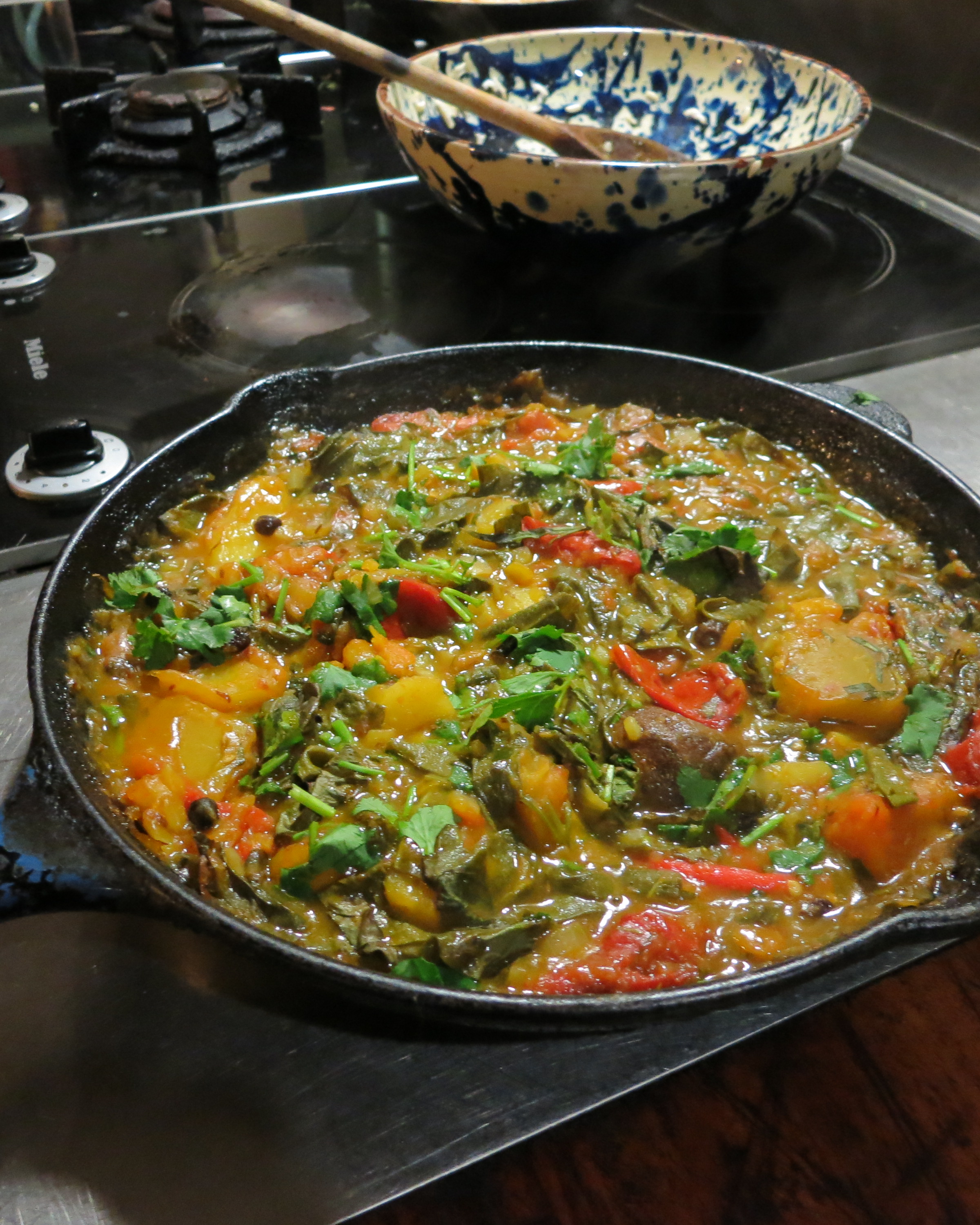 The oven was on and getting hot whilst the potatoes and pumpkin cooked until barely tender. Next in were a few quartered tomatoes, a whole chilli, a spoonful of currants (instead of barberries which I have never found in West Cork) a bunch of spinach and a big handful of coriander and tarragon. I gave everything a big stir then dumped it into an ovenproof dish and popped it into the oven for about fifteen minutes.
