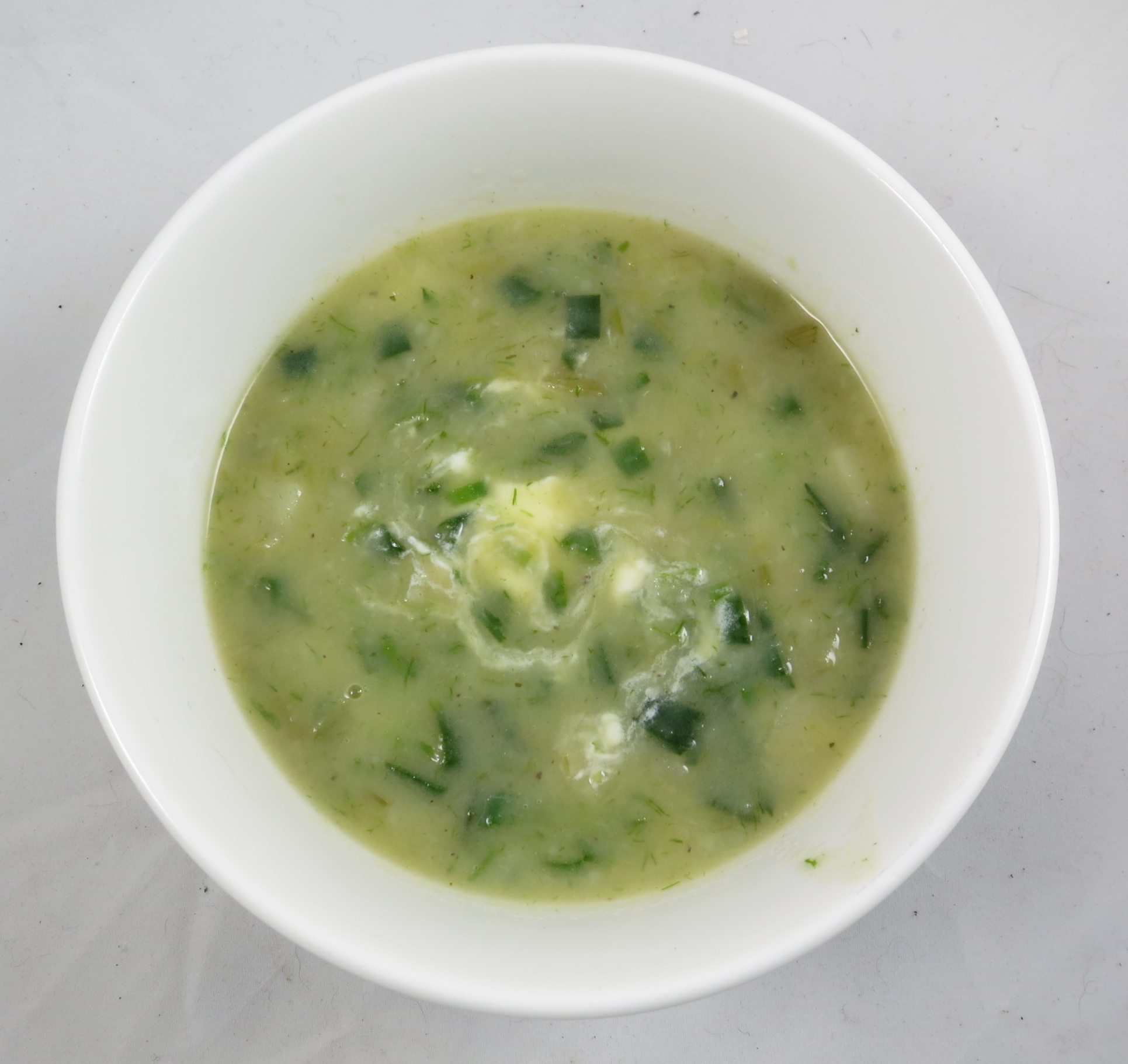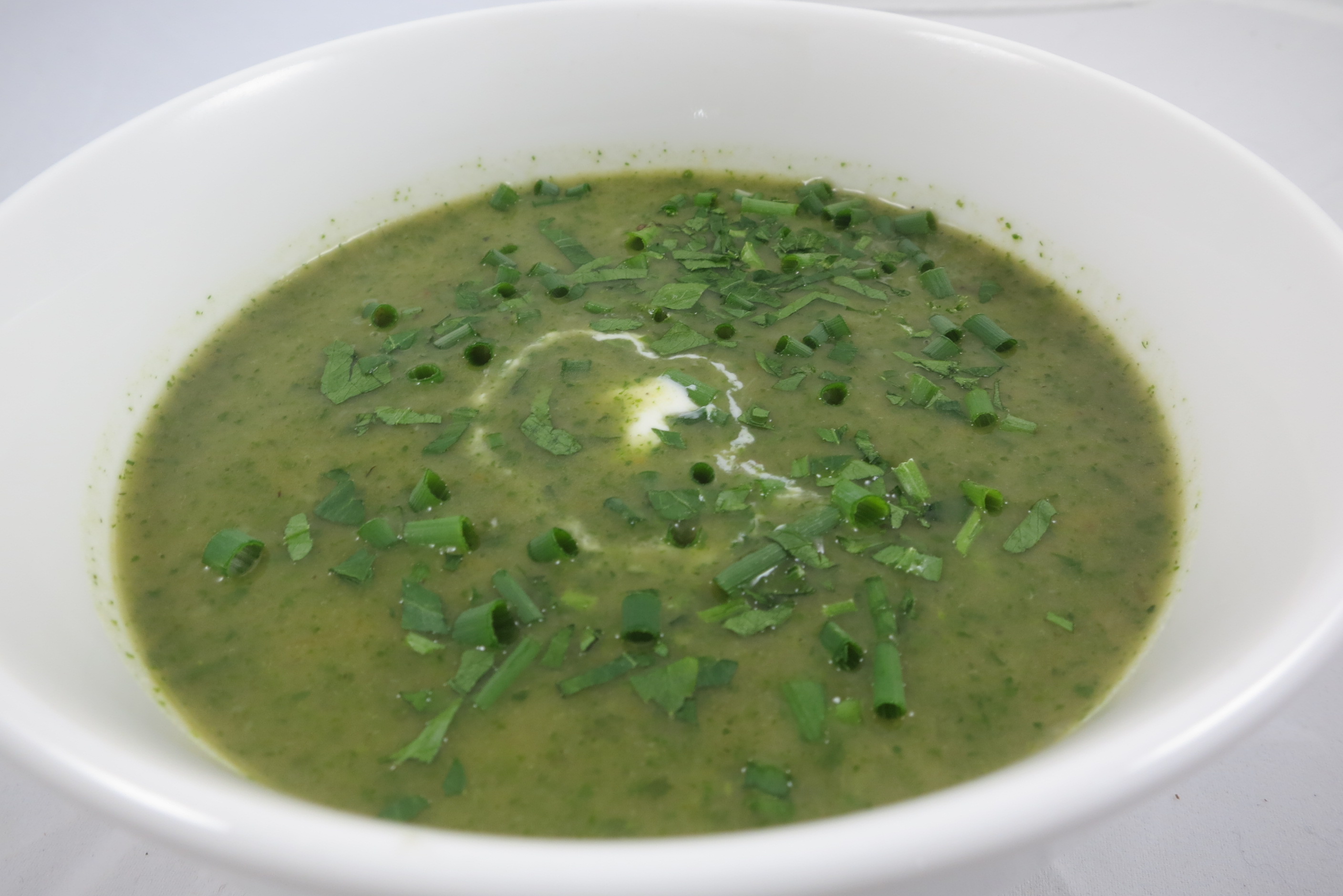 Chop the white part of the garlic first and add this to the onion/spud mix. Cook for five minutes then stir in about 600mls of vegetable stock – if the soup is too thick which is likely the consistency can be adjusted at the end. Bring to the boil and simmer for about five minutes. Chop the green part of the garlic and add into the soup. Cook for another couple of minutes then give the soup a brief buzz – I like to have lumpy bits in mine.