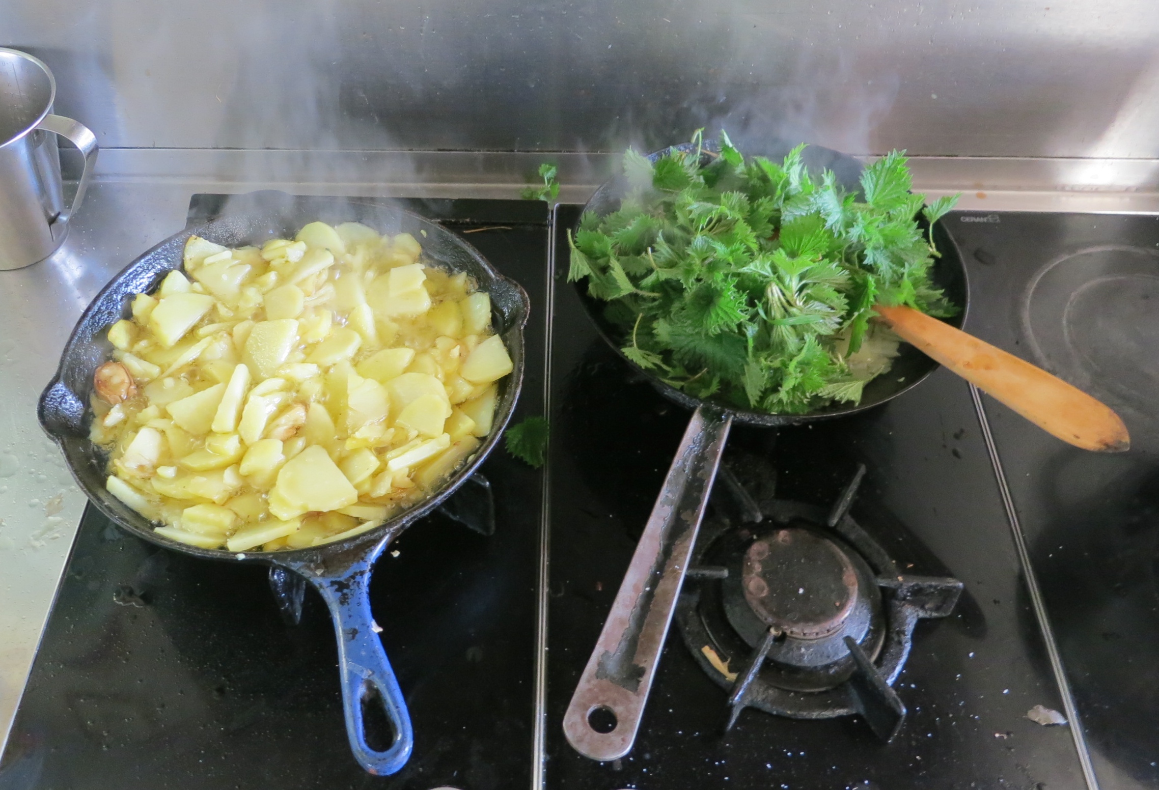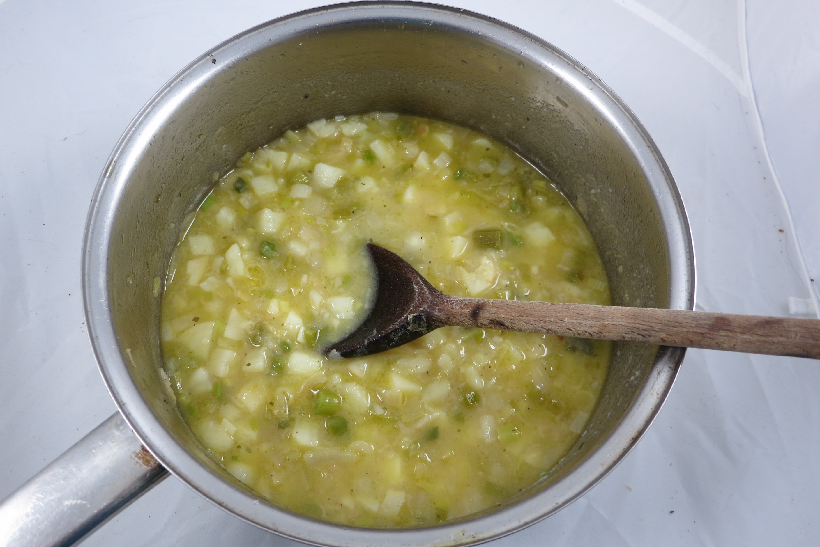 Melt the butter and olive oil together and then add the onion and celery. Sweat them gently whilst you peel and dice the potato. Stir the potato into the onion and celery, season with salt and black pepper and sautee gently for at least ten minutes. Give the occasional stir so that it doesn’t stick.