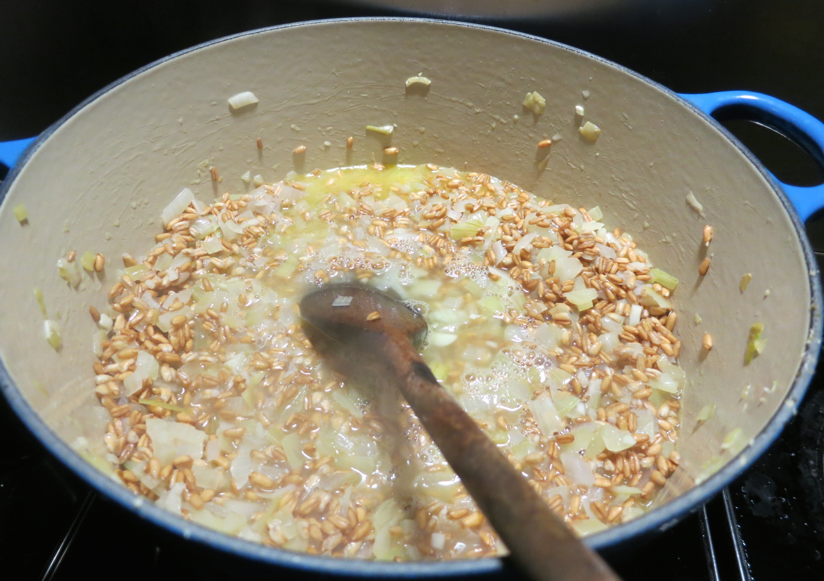 Drain the spelt and stir into the onions. cook for couple of minutes then add the wine.