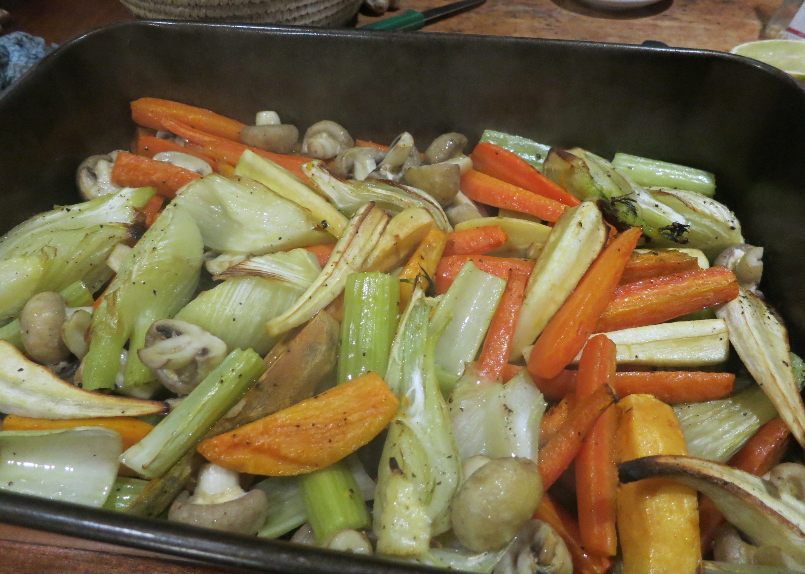 I used fennel, parsnips, sweet potato, carrots and celery. I don’t usually roast celery but we had an abundance so I chucked it in and it does roast well. Remember what looks like a mountain of vegetables will shrink considerably when roasted