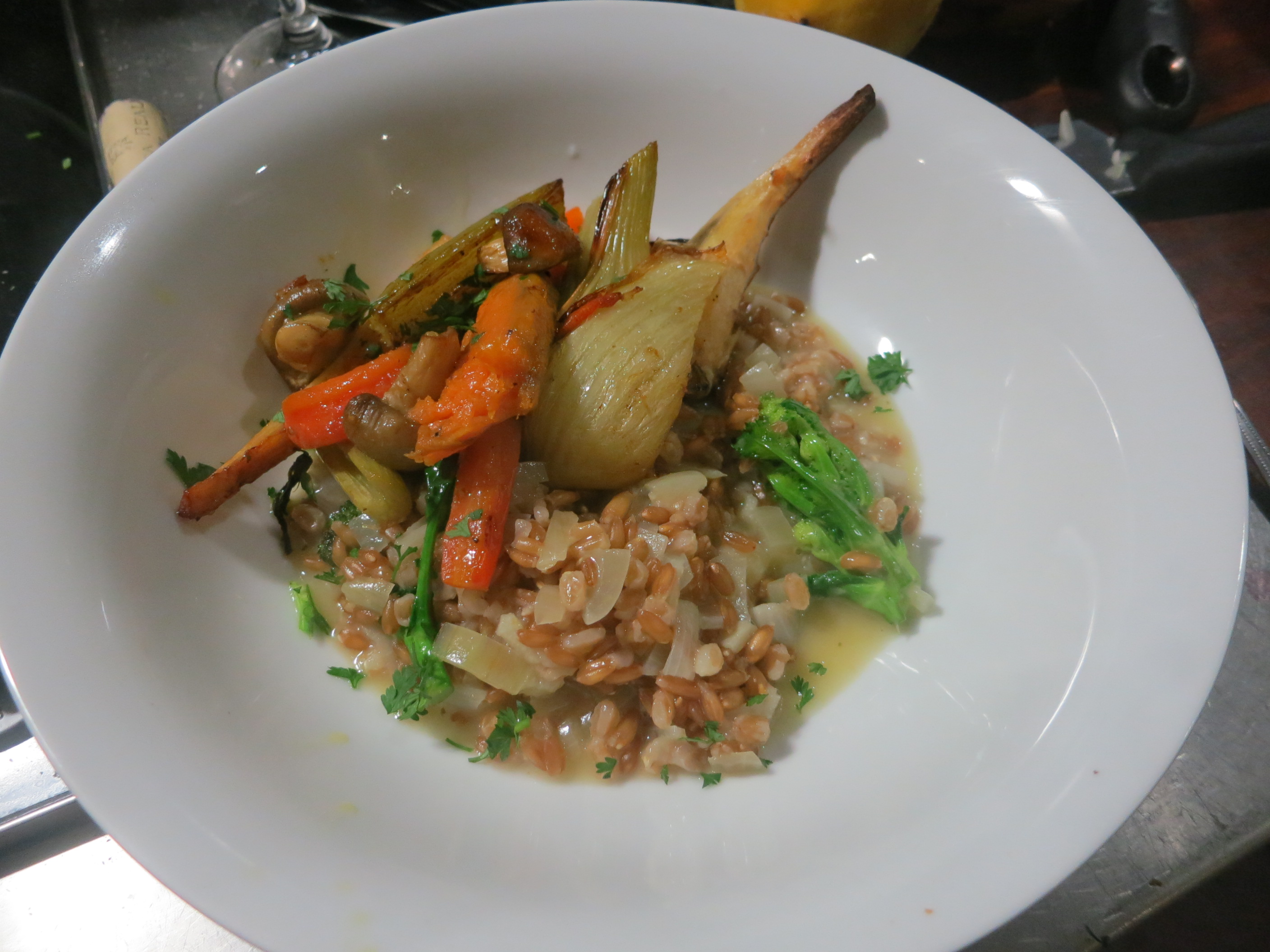What we did have was some whole spelt grain which I cooked like a risotto and served with some roasted veg. I basically cleaned out the veg basket. Anything too scabby went to the compost and the rest I peeled and tossed with olive oil, salt and pepper. The real crowning glory was the grated lemon zest which just happened to be a bergamot lemon. The flavour impact was deliciously exotic. I also stirred in a handful of sprouting broccoli from the garden and handful of chervil.