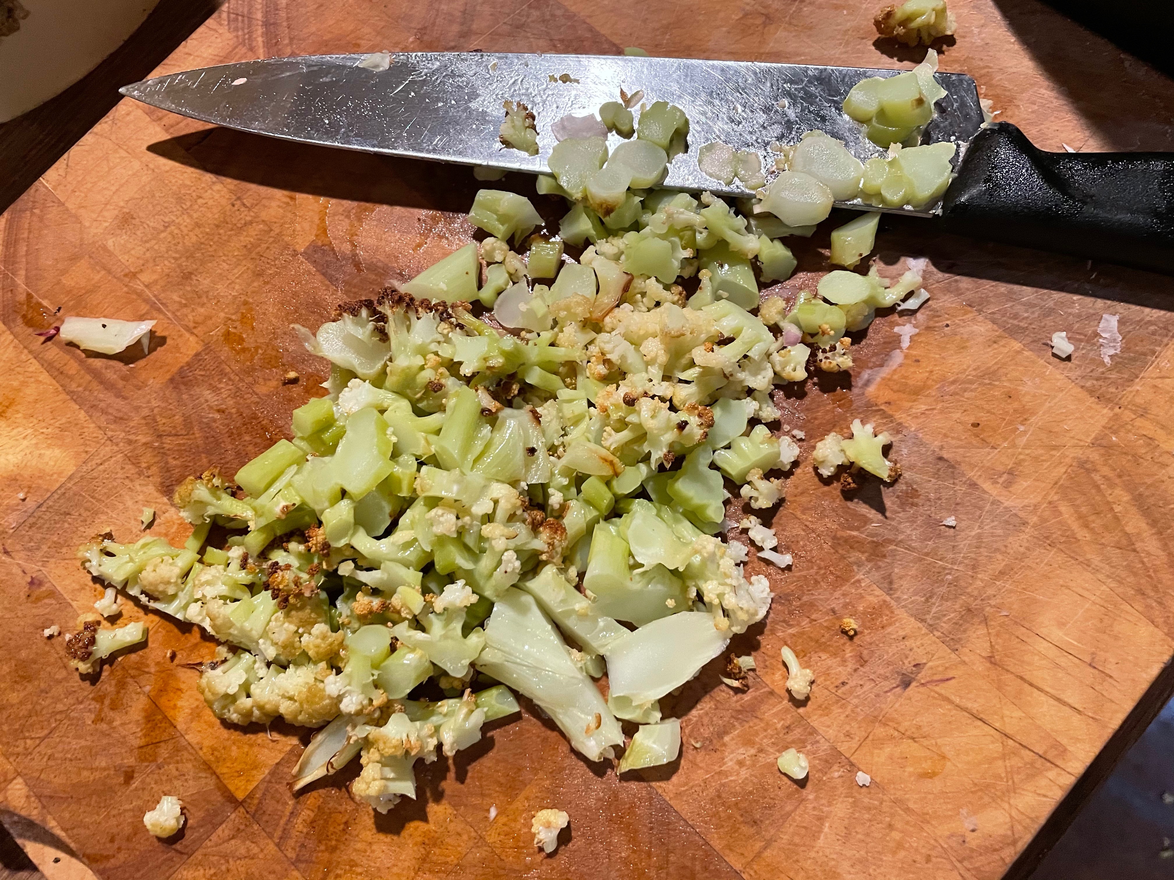 Break the cauliflower into even sized florets and toss with little olive oil and salt. Spread out on a large baking sheet and roast for 20 minutes. leave aside to cool a little then chop small.