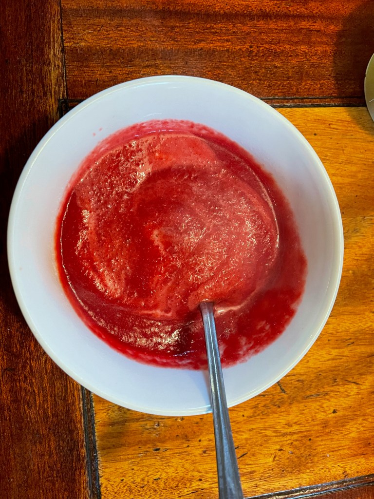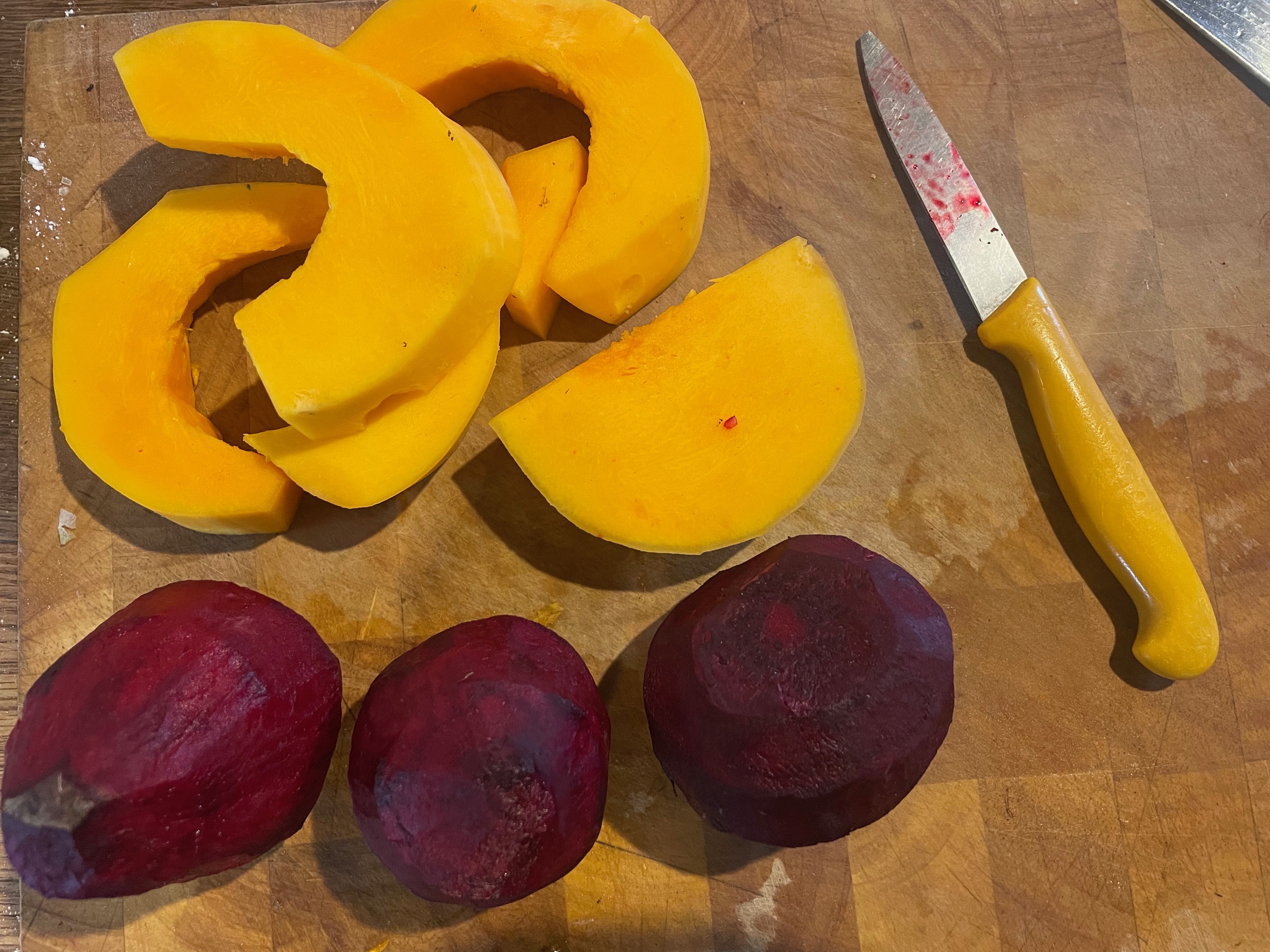 Whichever way you cook the beetroot – this can of course be done ahead of time – they need to cool enough for peeling. The skins should just slip off when ready.