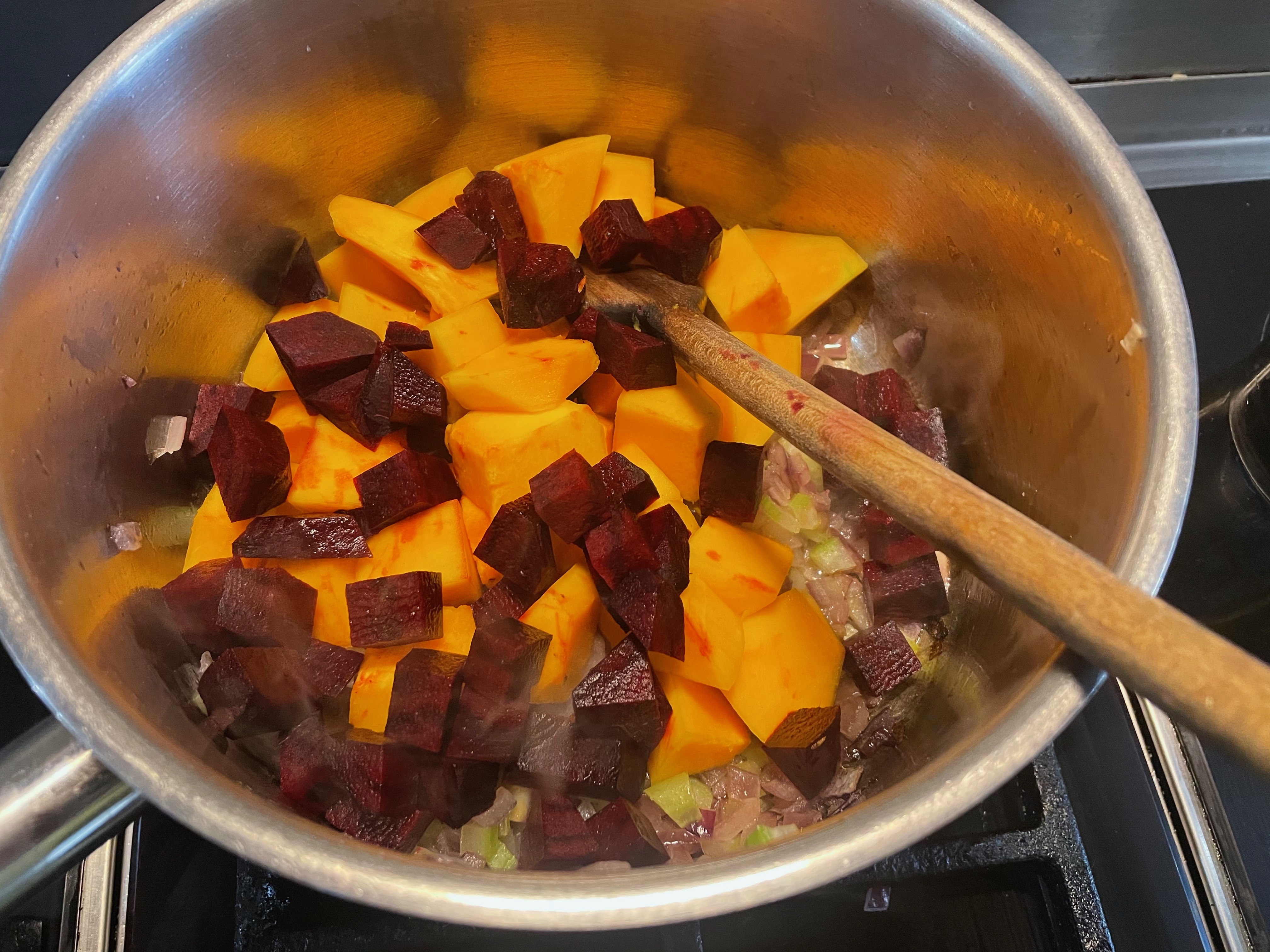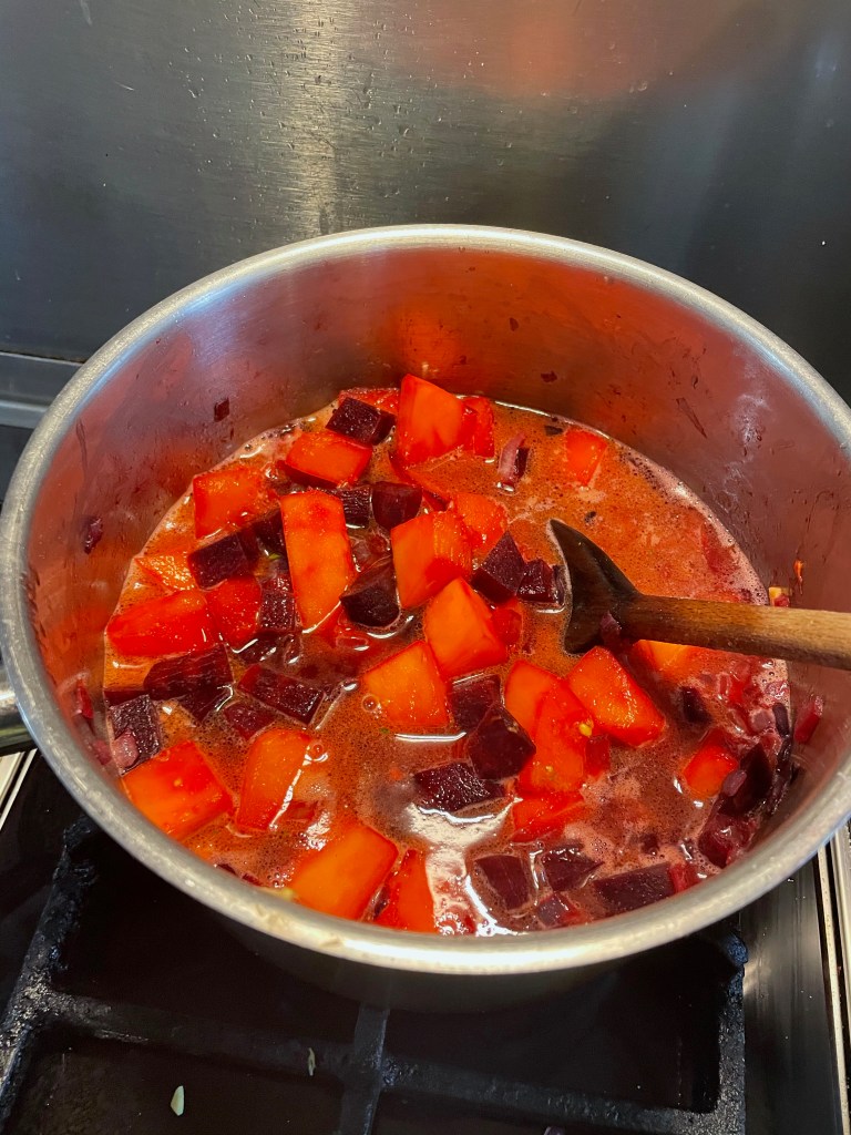 Wash the beetroots, trim the greens off but leave a little at the top otherwise the beets will bleed. There are two ways to cook the beets, roasting or boiling. Roasting definitely boosts the flavour but takes three times as long as boiling. For me how I cook the beetroots depends on how organised I am.
