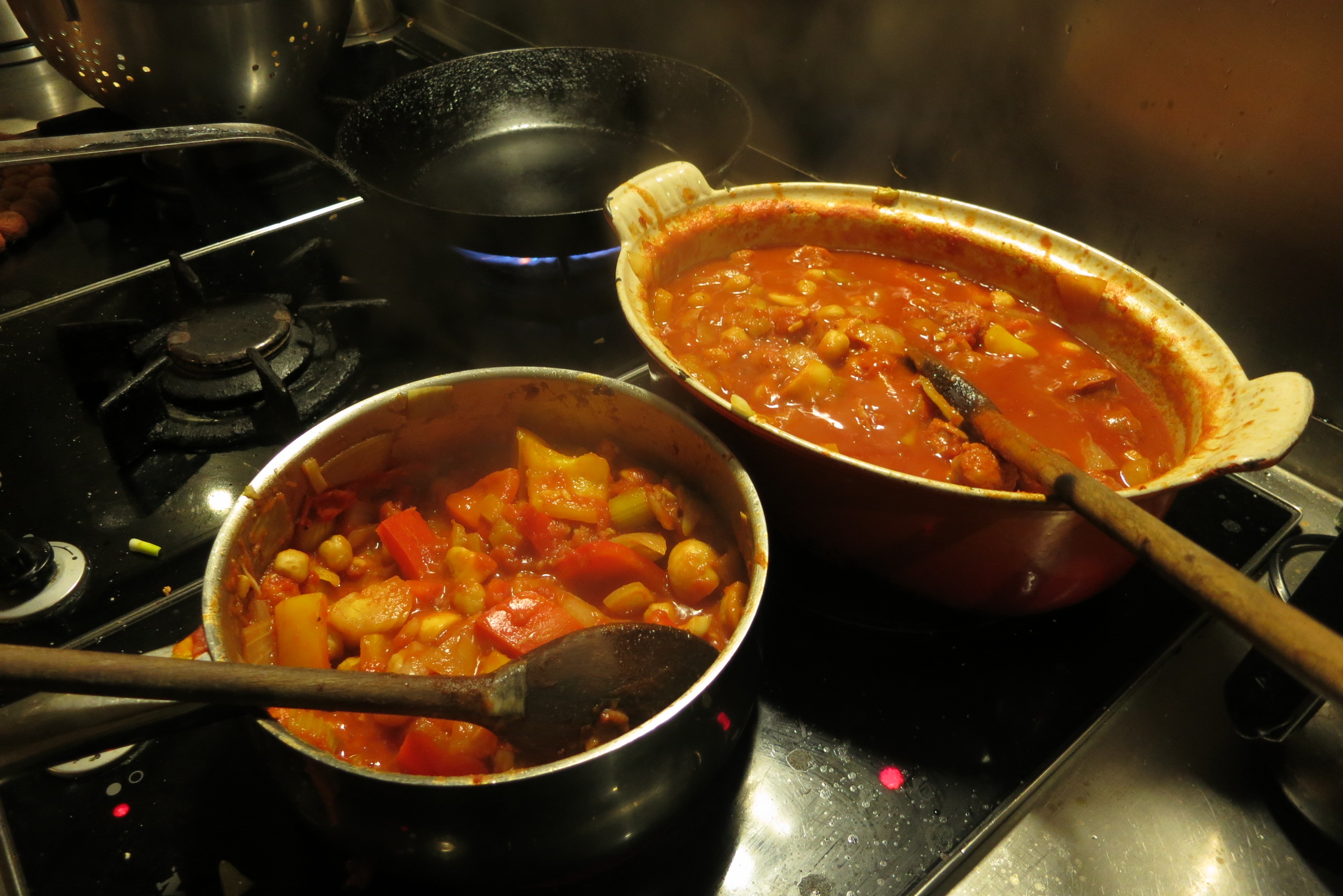 Last nights dinner was in two pots, chickpeas with vegetables for the vegetarians and chickpeas with chorizo, the tasty Spanish sausage that perks up any pot of beans for the chorizo eaters. Chorizo is like a flavour enhancer when cooked with beans. A little goes a long way and it takes the beans up a notch on the taste sensation front. The vegetarian version has smoked paprika which gives a tasty Spanish kick to the pot.