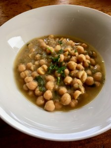 Put the olive oil into a heavy pot and heat gently. Add the chopped onion and cook until the onions melt down but don’t let them brown. Stir in the chopped garlic and cook for a further two minutes then add the chickpeas and bay leaf. Stir everything together for a few minutes then add enough water to cover everything by 2-3cm. Bring to the boil, reduce to a low simmer and cover with a tight fitting lid. Cook for one to one and a half hours or until the chickpeas are soft.